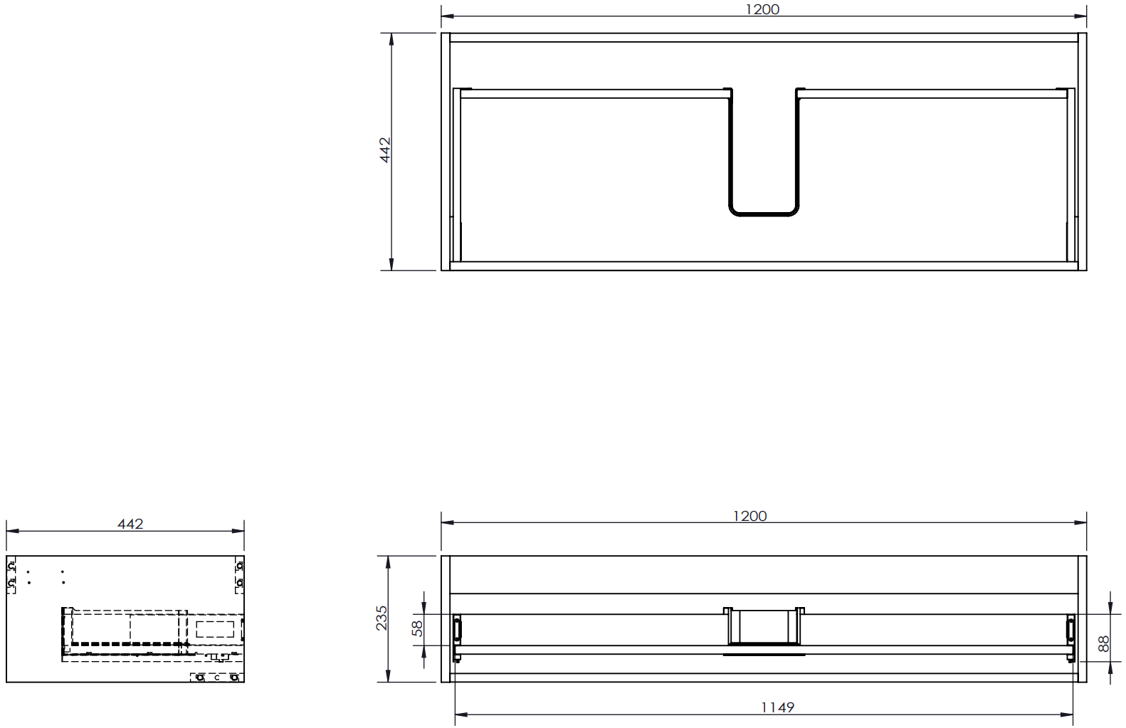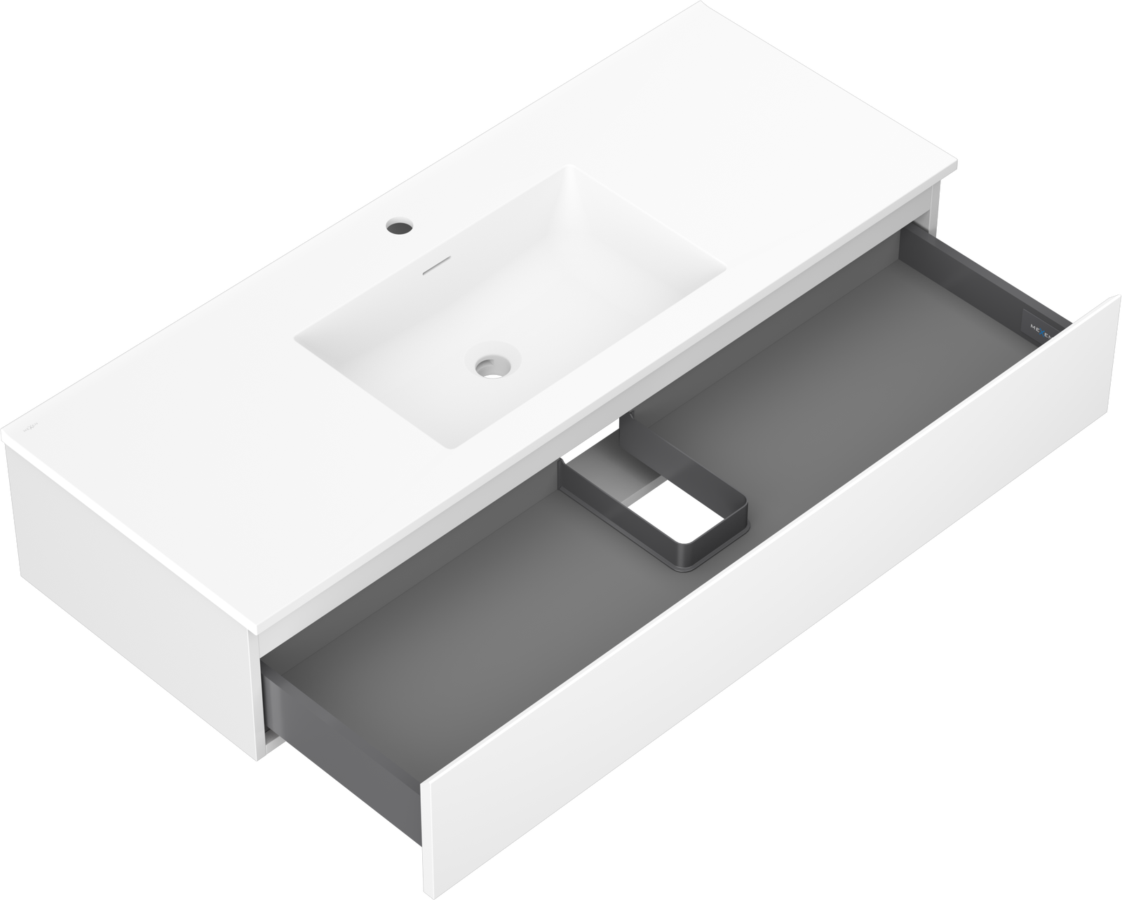 La découpe dans le tiroir est conçue de manière à accueillir le siphon, qui est nécessaire dans les installations de lavabo. Ainsi, le meuble peut être installé de manière pleinement fonctionnelle, sans devoir renoncer à l'espace du tiroir au profit de l'installation.