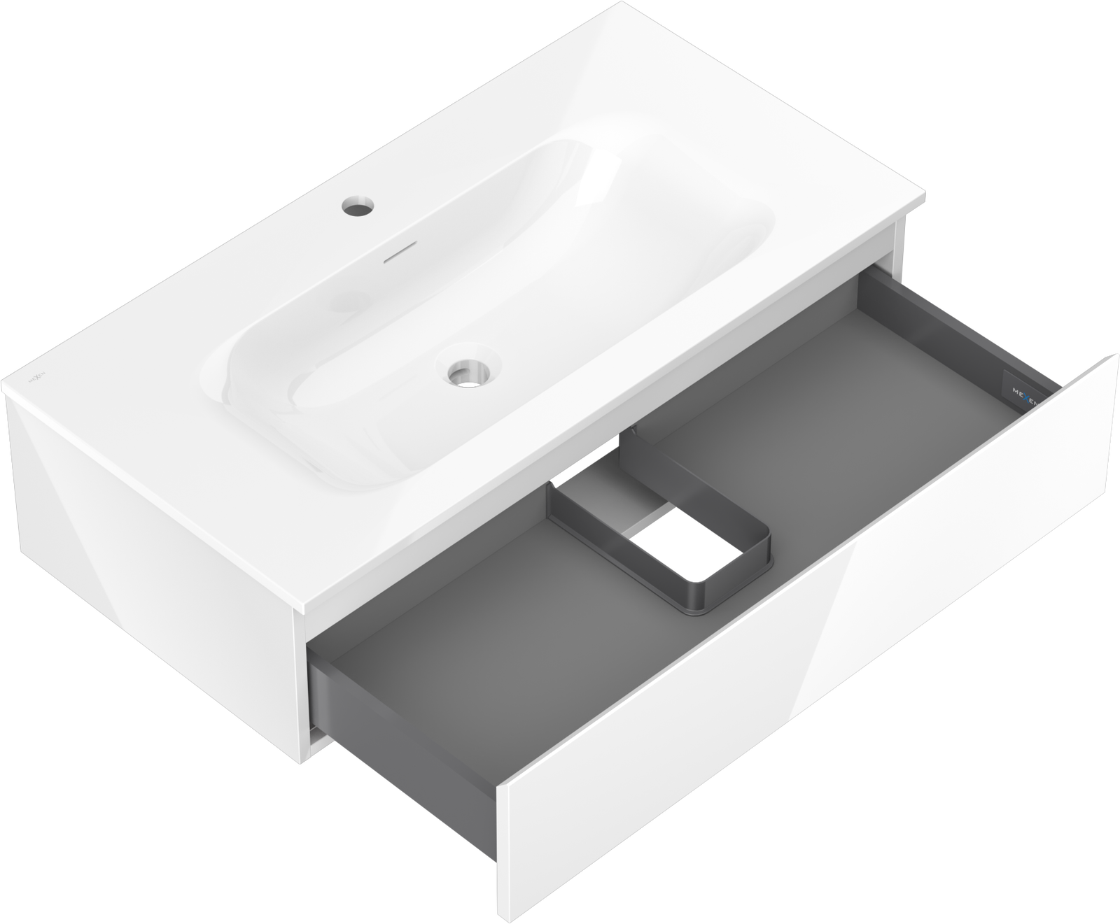 La découpe dans le tiroir est conçue de manière à accueillir le siphon, qui est nécessaire dans les installations de lavabo. Ainsi, le meuble peut être installé de manière pleinement fonctionnelle, sans devoir renoncer à l'espace du tiroir au profit de l'installation.