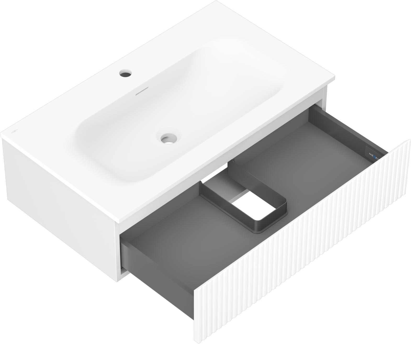 La découpe dans le tiroir est conçue de manière à accueillir le siphon, qui est nécessaire dans les installations de lavabo. Ainsi, le meuble peut être installé de manière pleinement fonctionnelle, sans devoir renoncer à l'espace du tiroir au profit de l'installation.