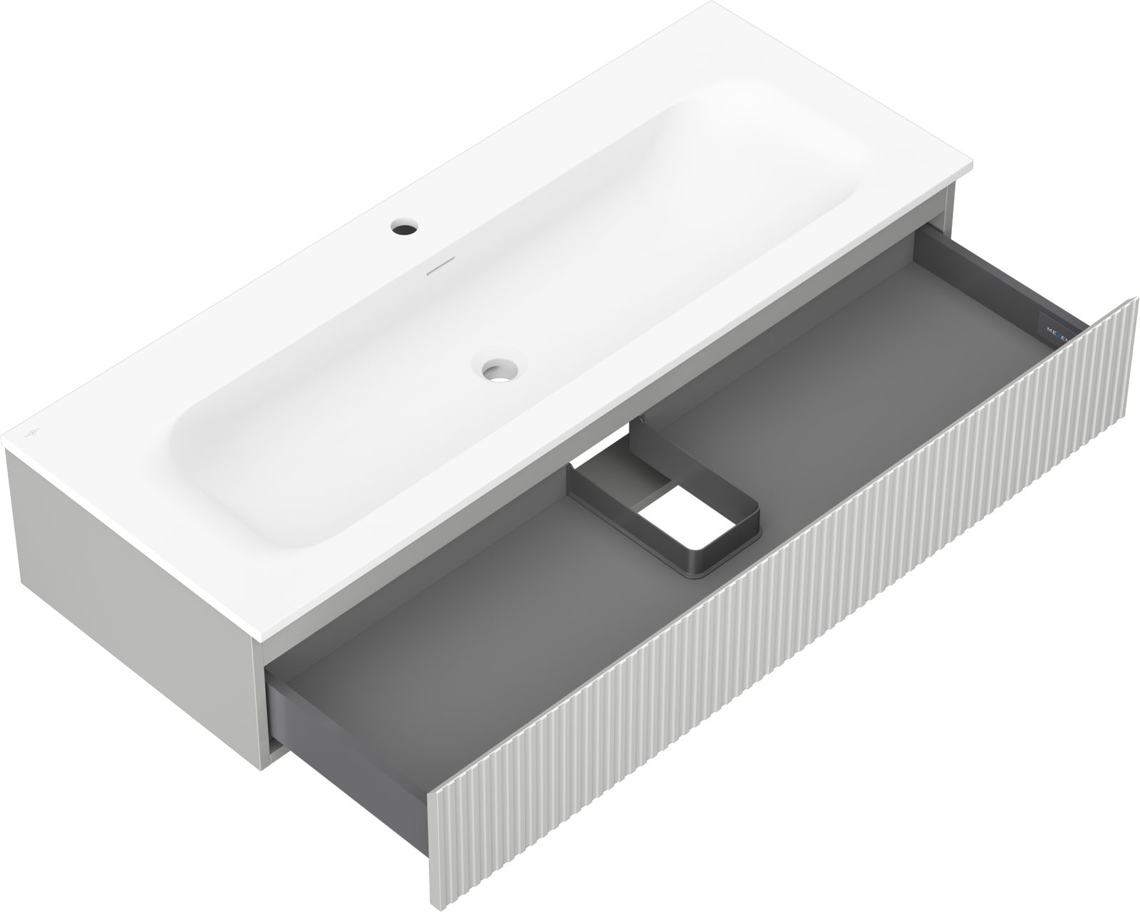 La découpe dans le tiroir est conçue de manière à accueillir le siphon, qui est nécessaire dans les installations de lavabo. Ainsi, le meuble peut être installé de manière pleinement fonctionnelle, sans devoir renoncer à l'espace du tiroir au profit de l'installation.