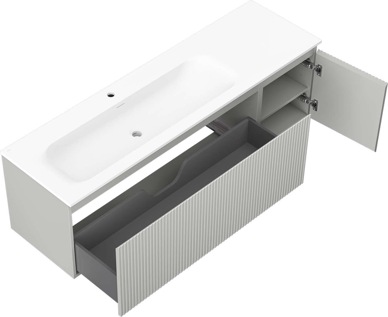 La découpe dans le tiroir est conçue de manière à accueillir le siphon, qui est nécessaire dans les installations de lavabo. Ainsi, le meuble peut être installé de manière pleinement fonctionnelle, sans devoir renoncer à l'espace du tiroir au profit de l'installation.