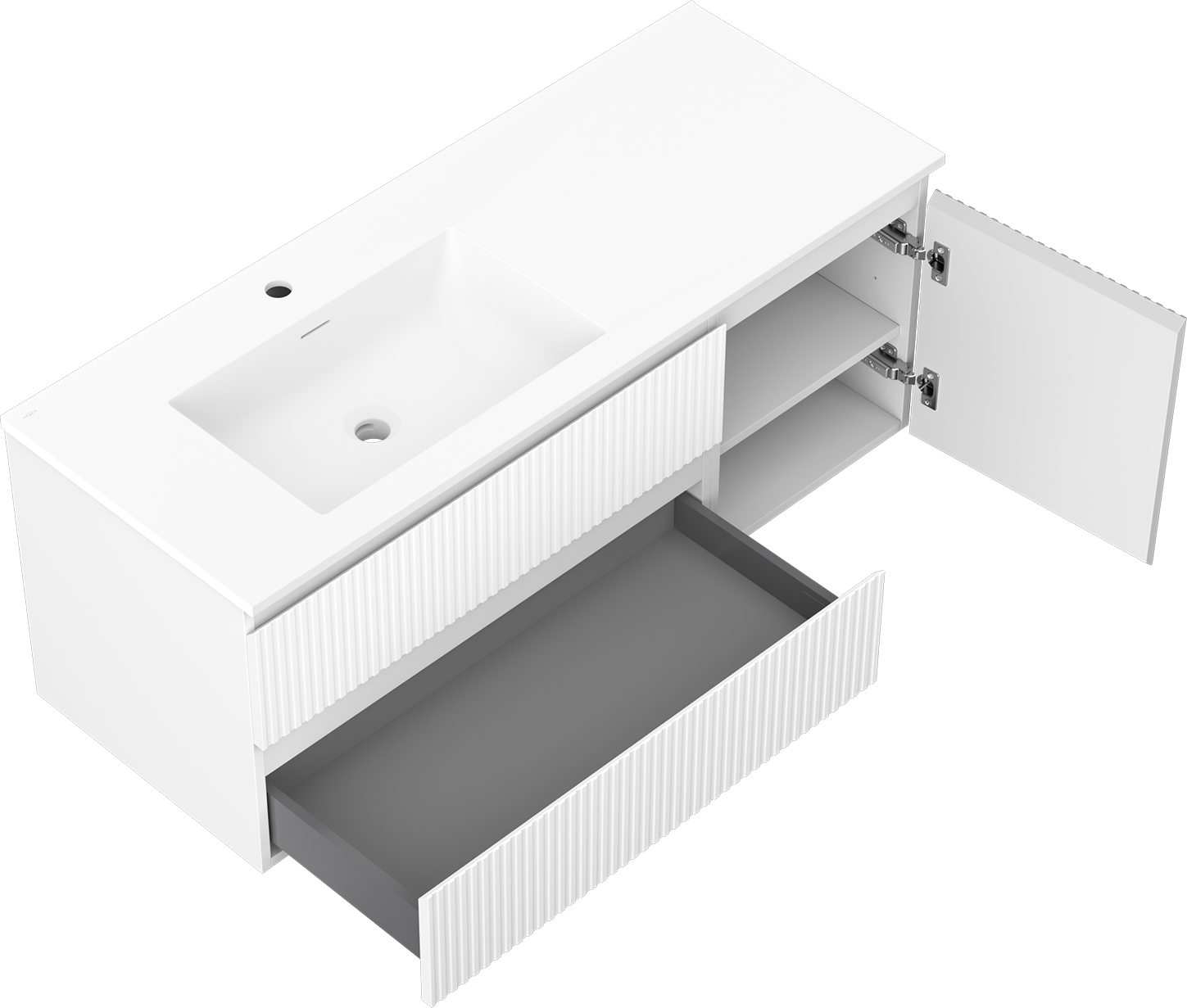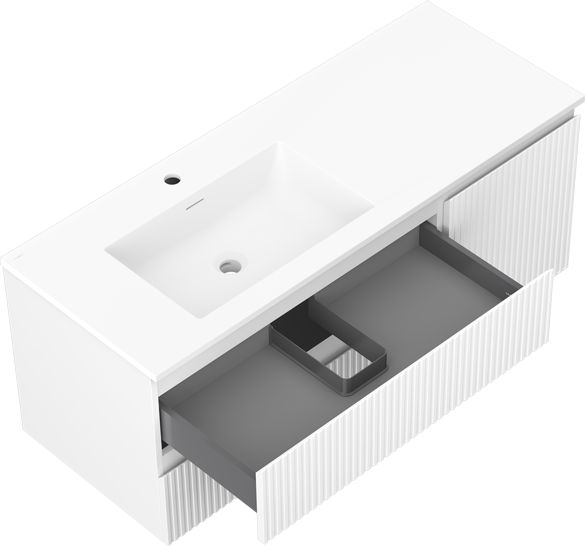 La découpe dans le tiroir est conçue de manière à accueillir le siphon, qui est nécessaire dans les installations de lavabo. Ainsi, le meuble peut être installé de manière pleinement fonctionnelle, sans devoir renoncer à l'espace du tiroir au profit de l'installation.
