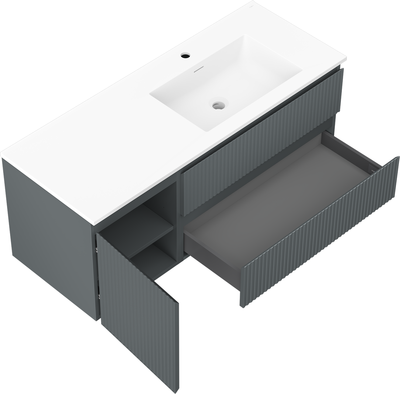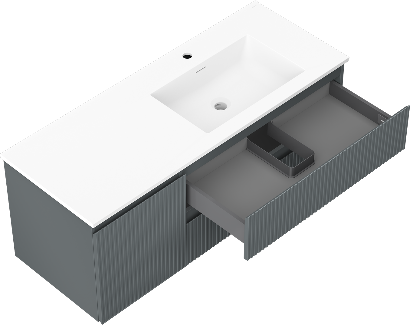 La découpe dans le tiroir est conçue de manière à accueillir le siphon, qui est nécessaire dans les installations de lavabo. Ainsi, le meuble peut être installé de manière pleinement fonctionnelle, sans devoir renoncer à l'espace du tiroir au profit de l'installation.