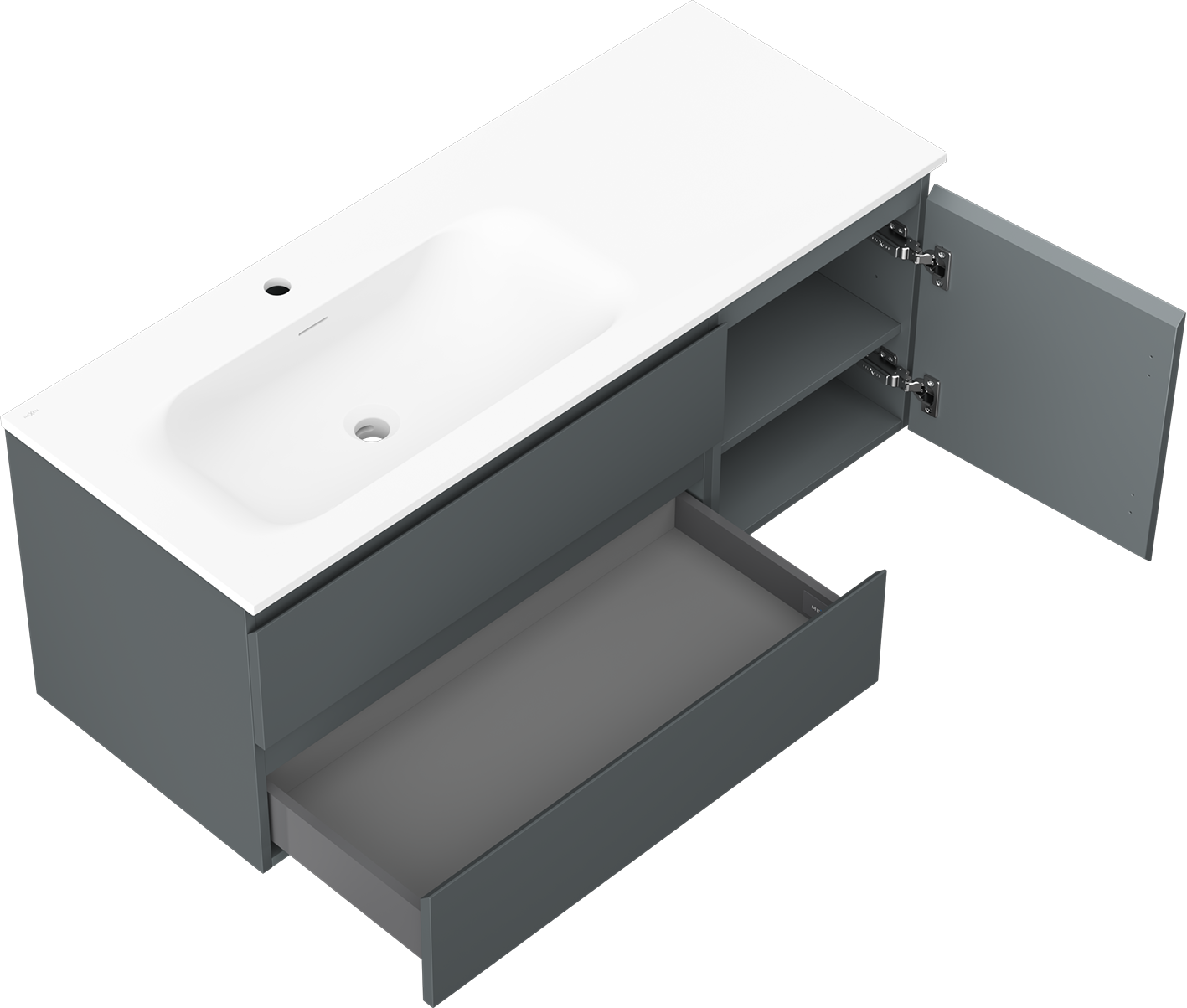 La découpe dans le tiroir est conçue de manière à accueillir le siphon, qui est nécessaire dans les installations de lavabo. Ainsi, le meuble peut être installé de manière pleinement fonctionnelle, sans devoir renoncer à l'espace du tiroir au profit de l'installation.