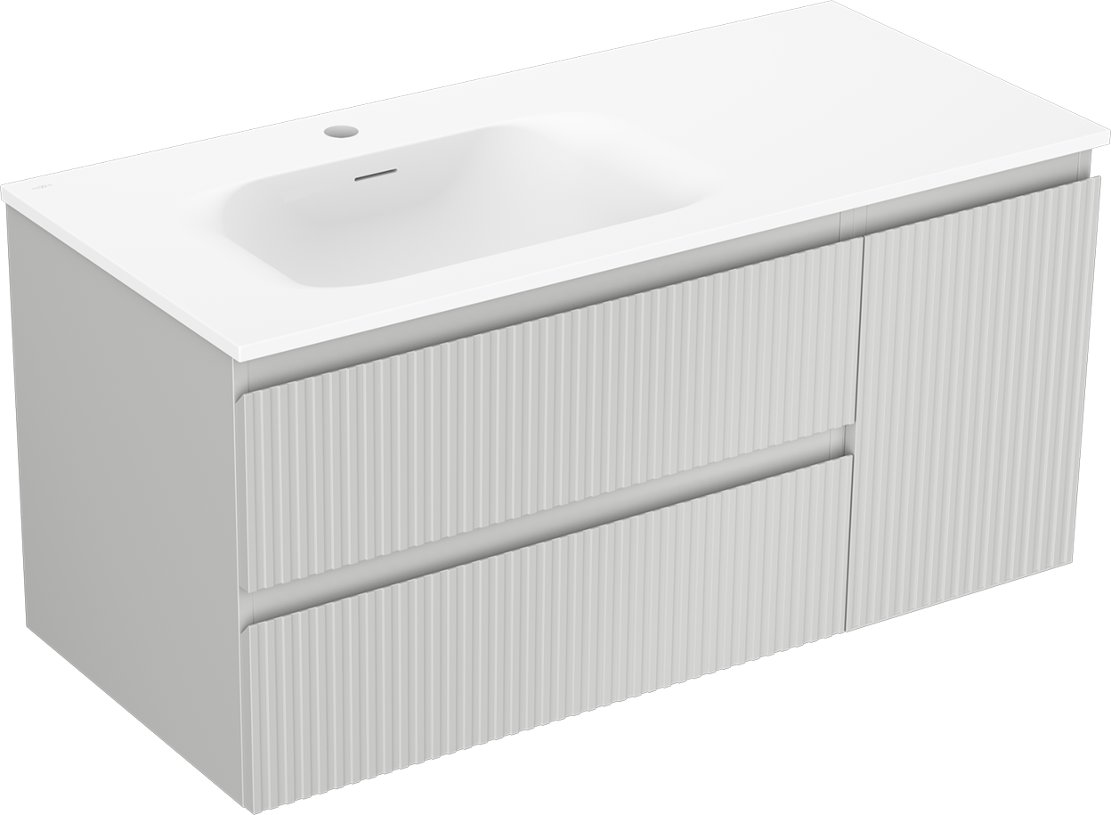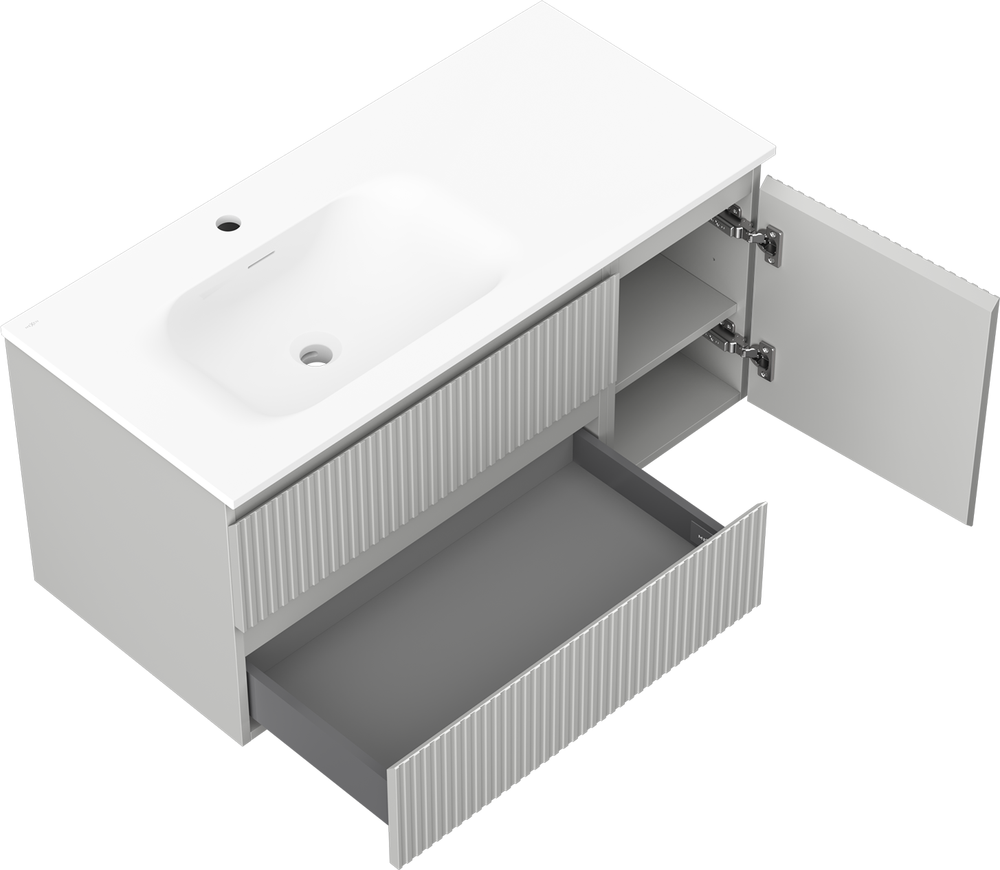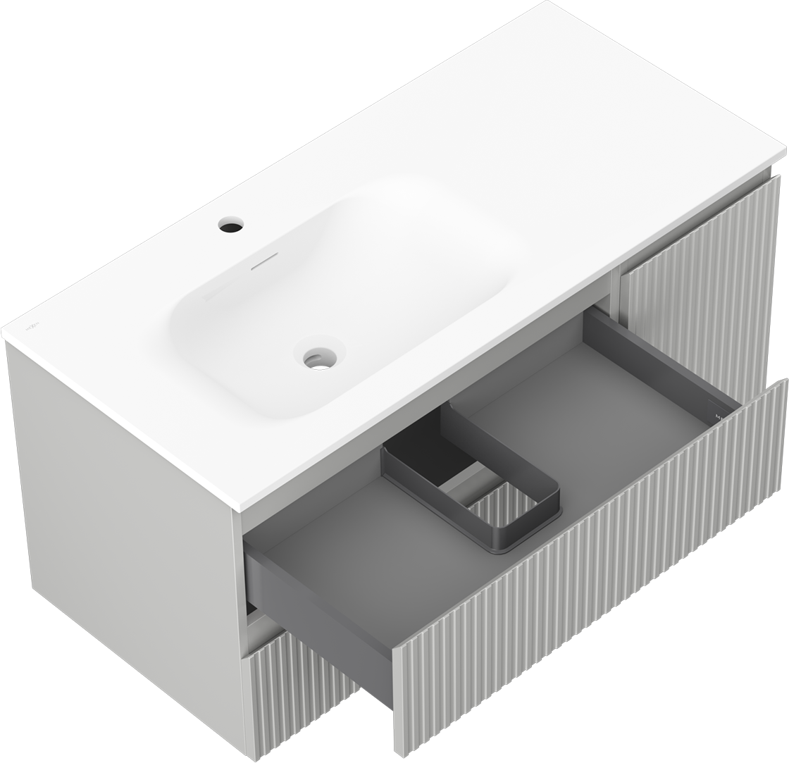 La découpe dans le tiroir est conçue de manière à accueillir le siphon, qui est nécessaire dans les installations de lavabo. Ainsi, le meuble peut être installé de manière pleinement fonctionnelle, sans devoir renoncer à l'espace du tiroir au profit de l'installation.