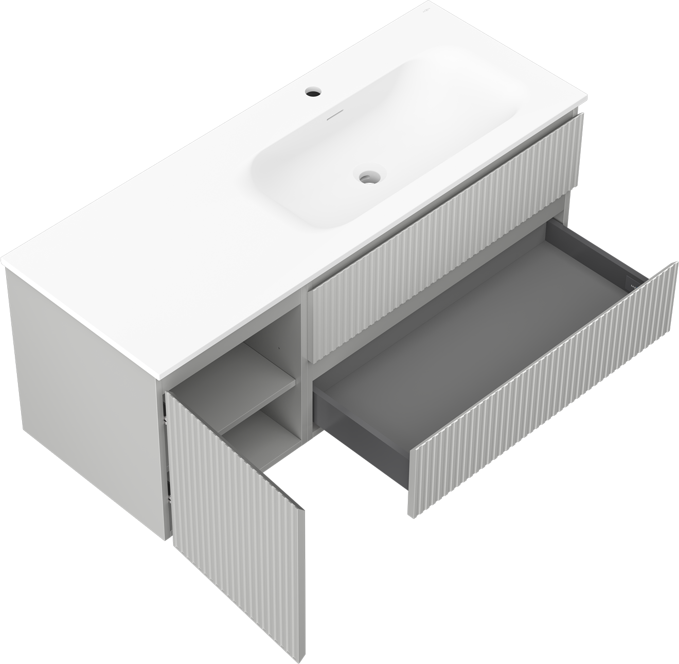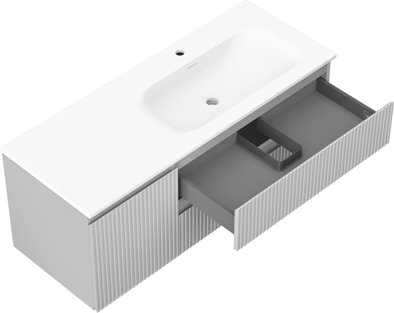 La découpe dans le tiroir est conçue de manière à accueillir le siphon, qui est nécessaire dans les installations de lavabo. Ainsi, le meuble peut être installé de manière pleinement fonctionnelle, sans devoir renoncer à l'espace du tiroir au profit de l'installation.