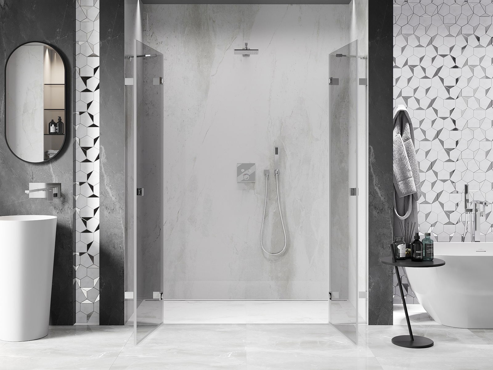 La poignée pratique et confortable est fabriquée en métal durable et résistant. Sa forme à la mode, combinée à une finition assortie à la couleur des profilés, donne à l'ensemble un aspect moderne et stylé, soulignant l'esthétique de chaque salle de bain.