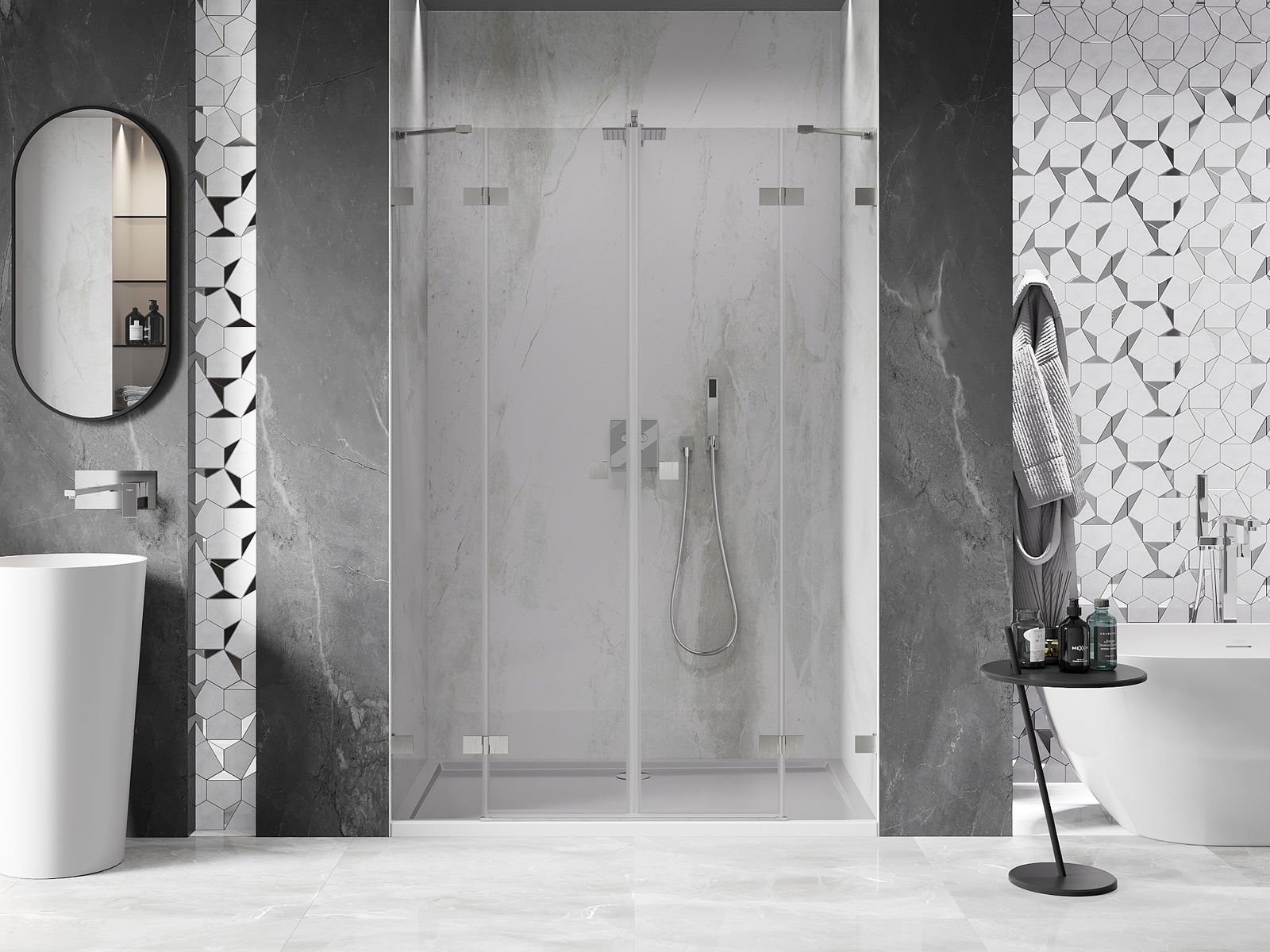 La poignée pratique et confortable est fabriquée en métal durable et résistant. Sa forme à la mode, combinée à une finition assortie à la couleur des profilés, donne à l'ensemble un aspect moderne et stylé, soulignant l'esthétique de chaque salle de bain.