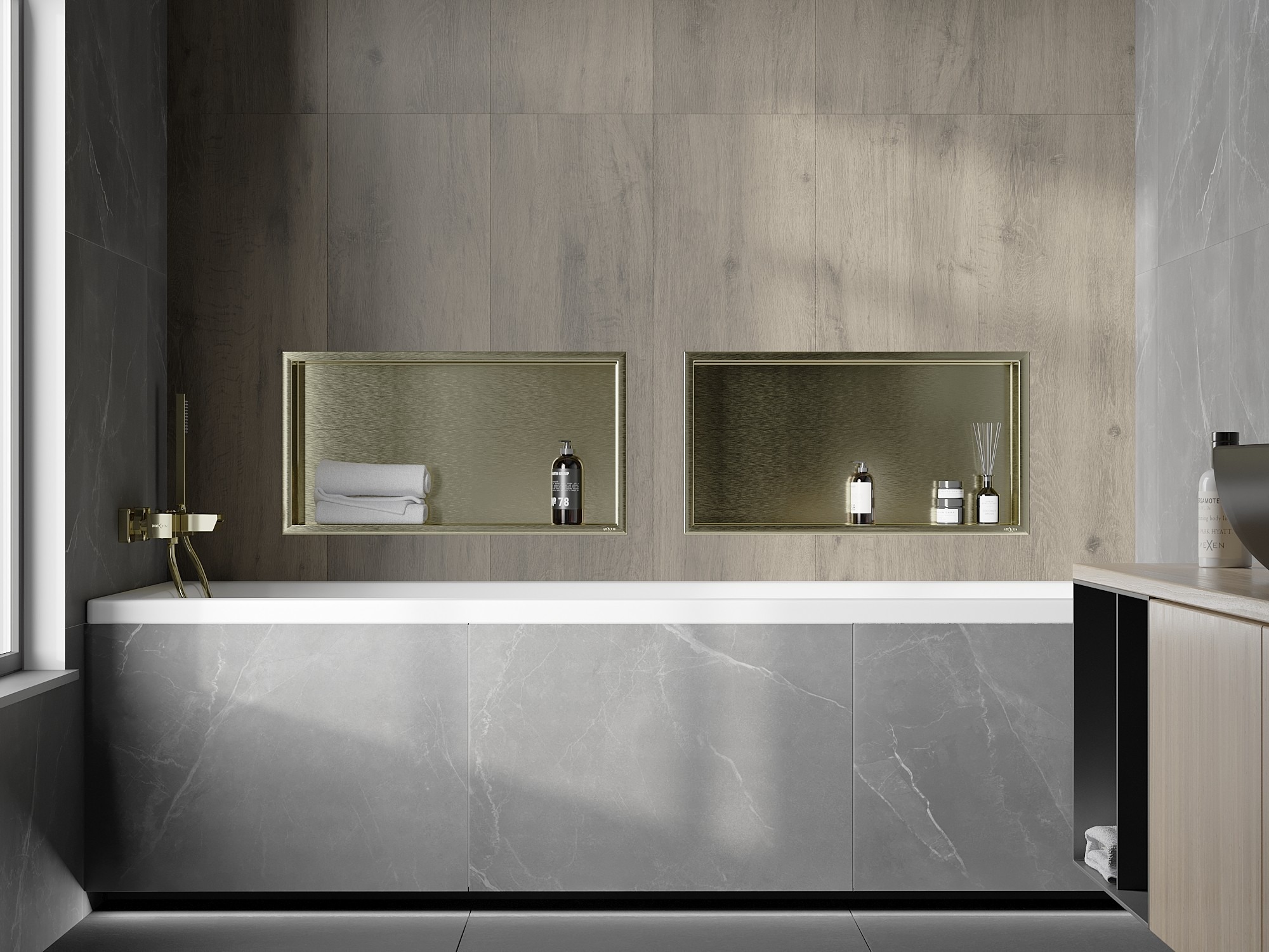 Elle personnalise la pièce : l'étagère entre la baignoire et le mur peut être réalisée avec de nombreux matériaux. Chez Mexen, vous trouverez un large choix de tablettes encastrées en composite, SMC (matériaux composites) ou en acier inoxydable.